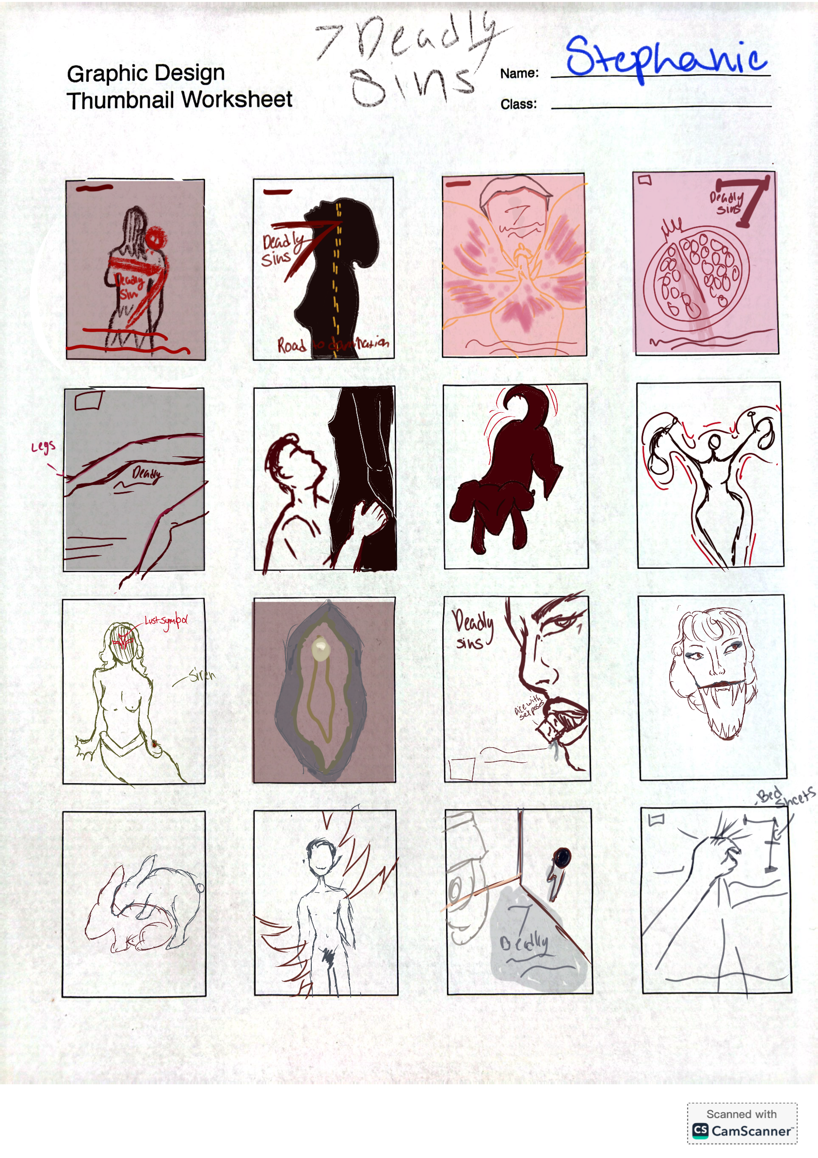 Nolasco's was tasked with creating a moving poster based on one of the seven sins or 7 virtues. She took the lead and went straight into the topic of lust, which is shown through her thumbnails and roughs. A sapphic set of a tongue and orchid is portrayed to show the hunger, sensuality, and rawness of lust.